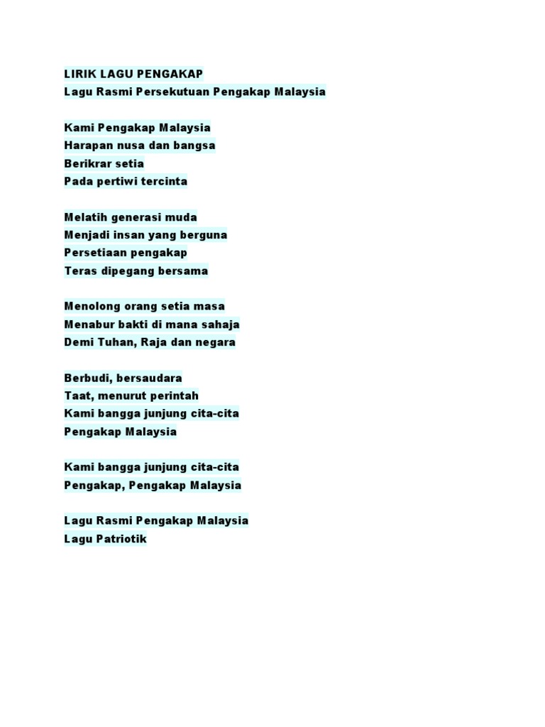 Kami pengakap malaysia harapan nusa dan bangsa berikrar setia pada pertiwi tercinta melatih generasi muda menjadi insan yang berguna persetian. Kumpulan lirik lagu-lagu malaysia. Platform kolaborasi music label Indonesia seperti Musica Trinity untuk membantu band-band lokal mendapatkan sponsor coaching menjual lagu dan membangun fan base.